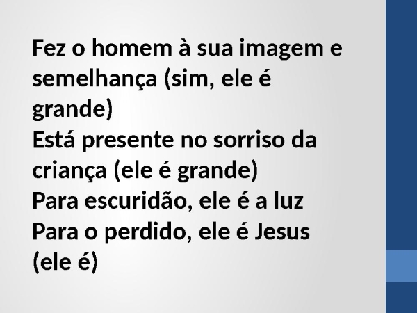 - Fez o homem à sua imagem e semelhança (sim, ele é grande)Está presente no sorriso da criança (ele é grande)Para escuridão, ele é a luzPara o perdido, ele é Jesus (ele é)