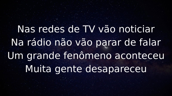 - Nas redes de TV vão noticiarNa rádio não vão parar de falarUm grande fenômeno aconteceuMuita gente desapareceu
