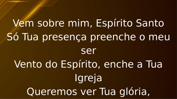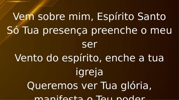 - Vem sobre mim, Espírito SantoSó Tua presença preenche o meu serVento do Espírito, enche a Tua IgrejaQueremos ver Tua glória,manifesta o Teu poder