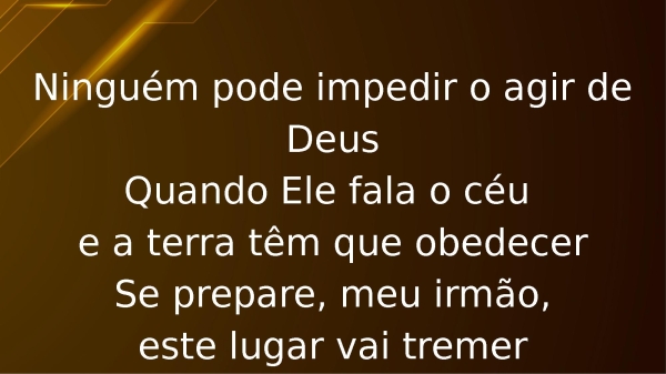 - Ninguém pode impedir o agir de DeusQuando Ele fala o céu e a terra têm que obedecerSe prepare, meu irmão,este lugar vai tremer