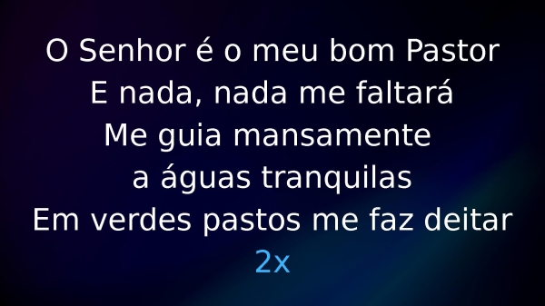 - O Senhor é o meu bom PastorE nada, nada me faltaráMe guia mansamentea águas tranquilasEm verdes pastos me faz deitar2x
