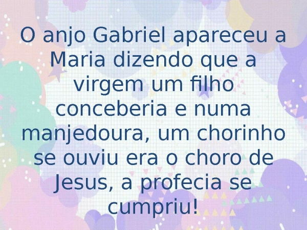 - O anjo Gabriel apareceu a Maria dizendo que a virgem um filho conceberia e numa manjedoura, um chorinho se ouviu era o choro de Jesus, a profecia se cumpriu!