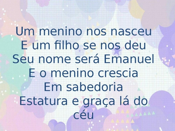 - Um menino nos nasceuE um filho se nos deuSeu nome será EmanuelE o menino cresciaEm sabedoriaEstatura e graça lá do céu