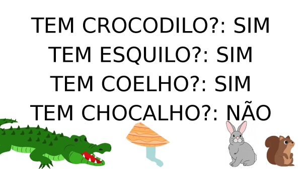 - TEM CROCODILO?: SIMTEM ESQUILO?: SIMTEM COELHO?: SIMTEM CHOCALHO?: NÃO