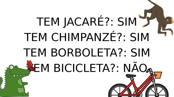- TEM JACARÉ?: SIMTEM CHIMPANZÉ?: SIMTEM BORBOLETA?: SIMTEM BICICLETA?: NÃO