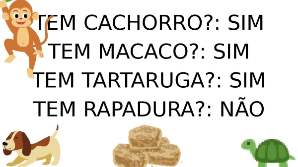 - TEM CACHORRO?: SIMTEM MACACO?: SIMTEM TARTARUGA?: SIMTEM RAPADURA?: NÃO
