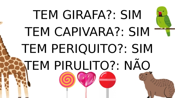 - TEM GIRAFA?: SIMTEM CAPIVARA?: SIMTEM PERIQUITO?: SIMTEM PIRULITO?: NÃO
