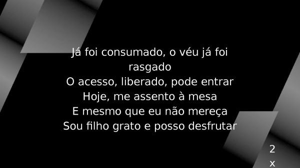- Já foi consumado, o véu já foi rasgadoO acesso, liberado, pode entrarHoje, me assento à mesaE mesmo que eu não mereçaSou filho grato e posso desfrutar2x