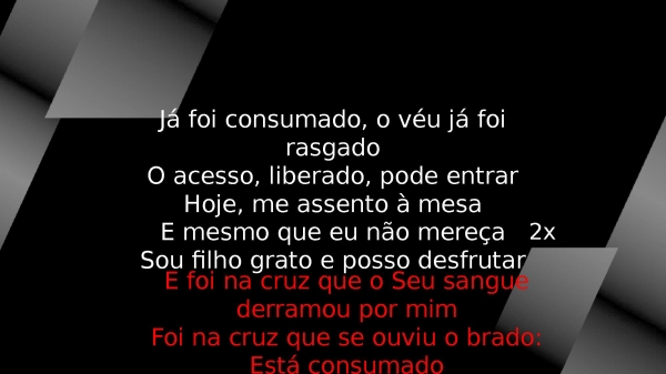 - Já foi consumado, o véu já foi rasgadoO acesso, liberado, pode entrarHoje, me assento à mesaE mesmo que eu não mereçaSou filho grato e posso desfrutar2xE foi na cruz que o Seu sangue derramou por mimFoi na cruz que se ouviu o brado: Está consumado