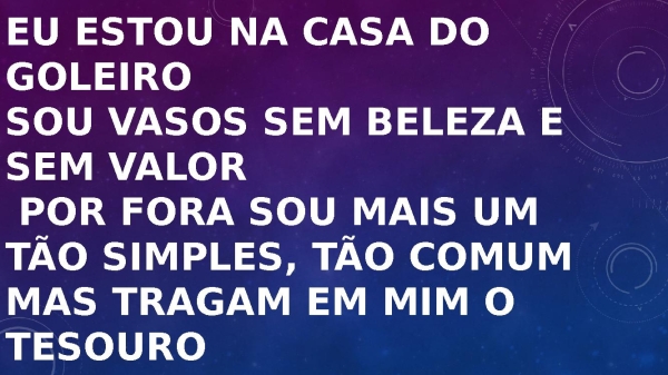 - Eu estou na casa do goleiroSou vasos SEM BELEZA E SEM VALOR Por fora sou mais umTão simples, Tão comumMas tragam em mim o tesouro