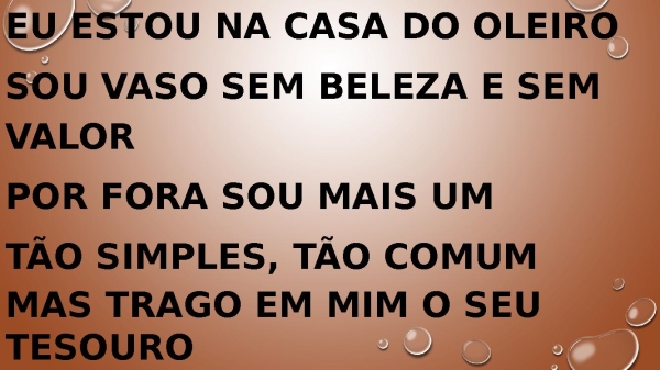 - Eu estou na casa do oleiro Sou vaso sem beleza e sem valor Por fora sou mais um Tão simples, tão comum Mas trago em mim o Seu tesouro