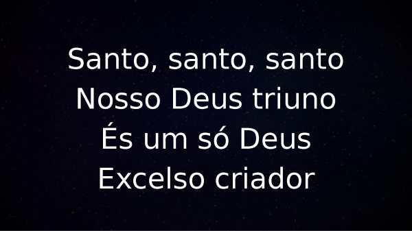 - Santo, santo, santoNosso Deus triunoÉs um só DeusExcelso criador