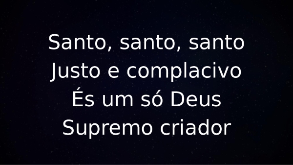 - Santo, santo, santoJusto e complacivoÉs um só DeusSupremo criador