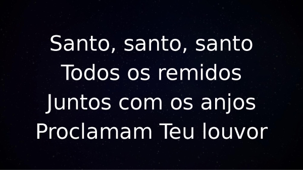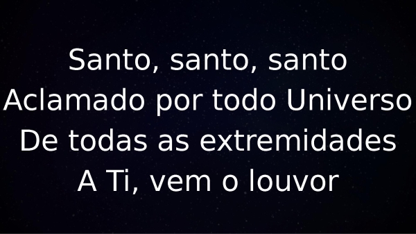 - Santo, santo, santoAclamado por todo UniversoDe todas as extremidadesA Ti, vem o louvor