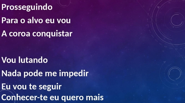 - Prosseguindo Para o alvo eu vou A coroa conquistar Vou lutando Nada pode me impedir Eu vou te seguir Conhecer-te eu quero mais