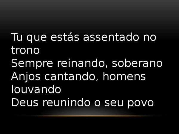 - Tu que estás assentado no tronoSempre reinando, soberanoAnjos cantando, homens louvandoDeus reunindo o seu povo
