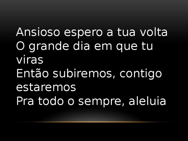 - Ansioso espero a tua voltaO grande dia em que tu virasEntão subiremos, contigo estaremosPra todo o sempre, aleluia