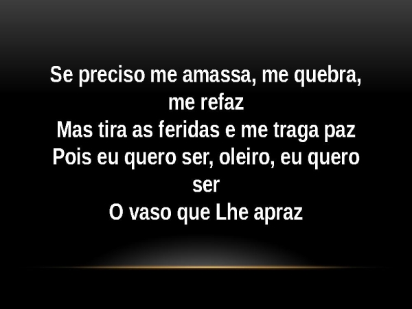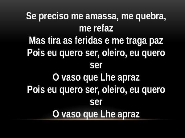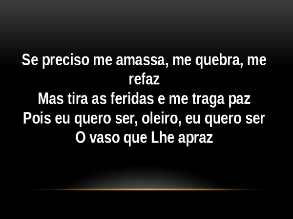 - Se preciso me amassa, me quebra, me refazMas tira as feridas e me traga pazPois eu quero ser, oleiro, eu quero serO vaso que Lhe apraz