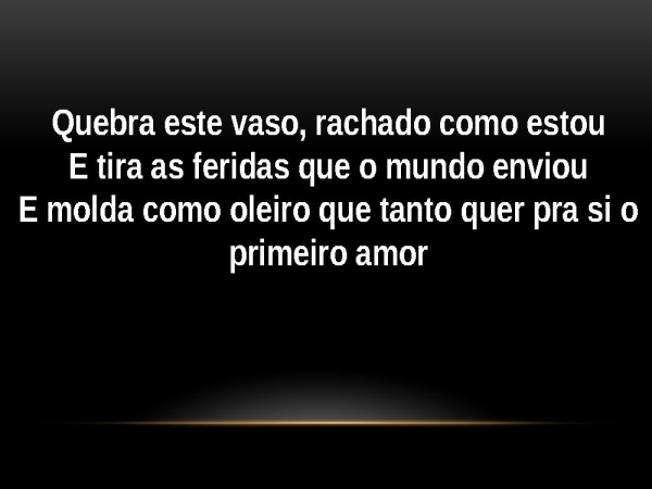 - Quebra este vaso, rachado como estouE tira as feridas que o mundo enviouE molda como oleiro que tanto quer pra si o primeiro amor