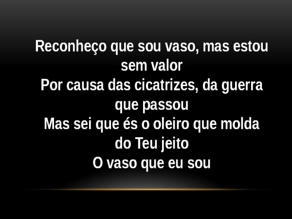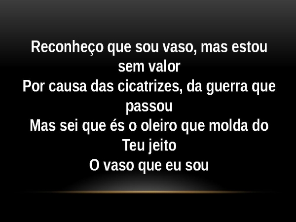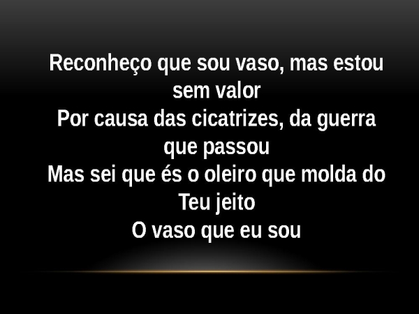 - Reconheço que sou vaso, mas estou sem valorPor causa das cicatrizes, da guerra que passouMas sei que és o oleiro que molda do Teu jeitoO vaso que eu sou