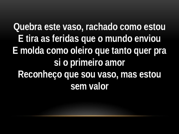- Quebra este vaso, rachado como estouE tira as feridas que o mundo enviouE molda como oleiro que tanto quer pra si o primeiro amorReconheço que sou vaso, mas estou sem valor