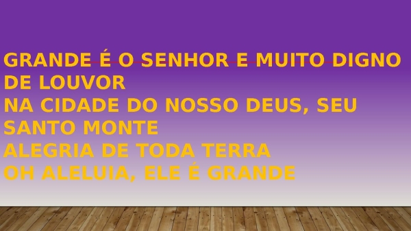 - Grande é o senhor e muito digno de louvor Na cidade do nosso deus, seu santo monte Alegria de toda terra Oh aleluia, ele é grande