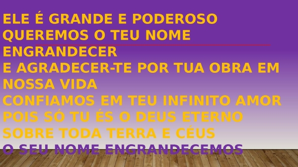 - Ele é grande e poderoso Queremos o teu nome engrandecer E agradecer-te por tua obra em nossa vida Confiamos em teu infinito amor Pois só tu és o Deus eterno sobre toda terra e céus O seu nome engrandecemos