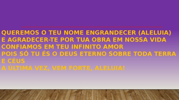 - Queremos o teu nome engrandecer (aleluia) E agradecer-te por tua obra em nossa vida Confiamos em teu infinito amor Pois só tu és o Deus eterno sobre toda terra e céus A última vez, vem forte, aleluia!