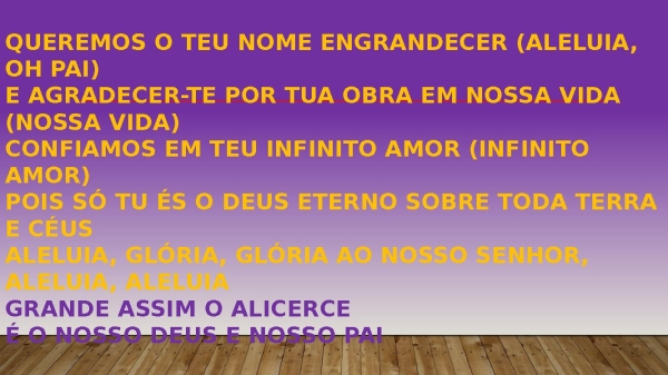 - Queremos o teu nome engrandecer (aleluia, oh pai) E agradecer-te por tua obra em nossa vida (nossa vida) Confiamos em teu infinito amor (infinito amor) Pois só tu és o Deus eterno sobre toda terra e céus Aleluia, glória, glória ao nosso senhor, aleluia, aleluia Grande assim o alicerce É o nosso Deus e nosso pai