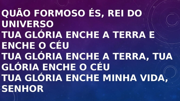 - Quão formoso és, rei do universo Tua glória enche a terra e enche o céu Tua glória enche a terra, Tua glória enche o céu Tua glória enche minha vida, Senhor