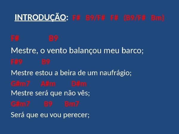 - INTRODUÇÃO: F# B9/F# F# (B9/F# Bm)F# B9Mestre, o vento balançou meu barco;F#9 B9Mestre estou a beira de um naufrágio;G#m7 A#m D#m Mestre será que não vês;G#m7 B9 Bm7Será que eu vou perecer;