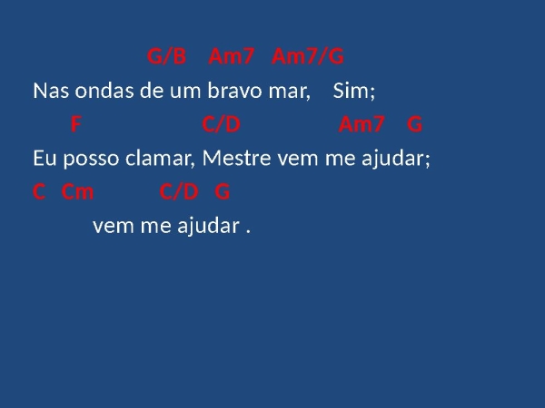 - G/B Am7 Am7/G Nas ondas de um bravo mar, Sim; F C/D Am7 GEu posso clamar, Mestre vem me ajudar;C Cm C/D G vem me ajudar .