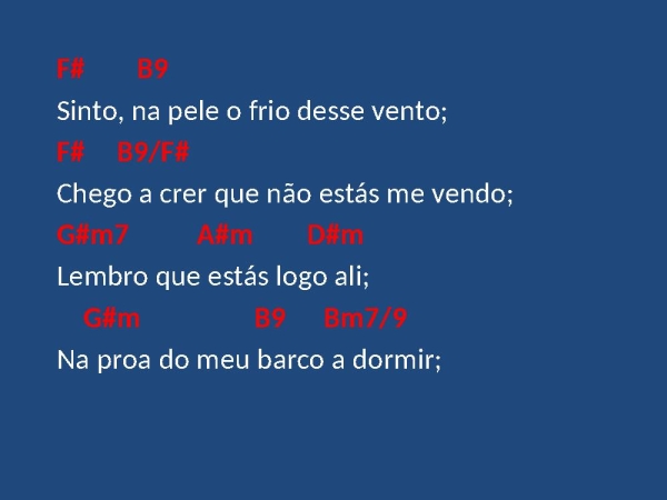 - F# B9 Sinto, na pele o frio desse vento;F# B9/F#Chego a crer que não estás me vendo;G#m7 A#m D#m Lembro que estás logo ali; G#m B9 Bm7/9Na proa do meu barco a dormir;