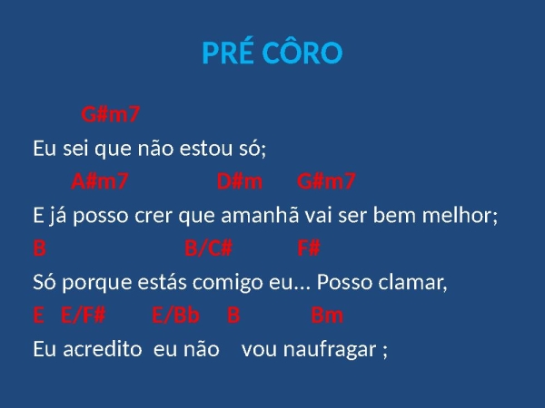 - PRÉ CÔRO G#m7 Eu sei que não estou só; A#m7 D#m G#m7E já posso crer que amanhã vai ser bem melhor;B B/C# F# Só porque estás comigo eu... Posso clamar, E E/F# E/Bb B Bm Eu acredito eu não vou naufragar ;
