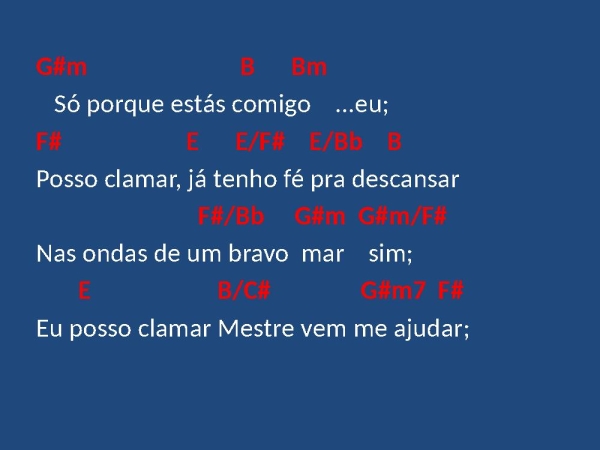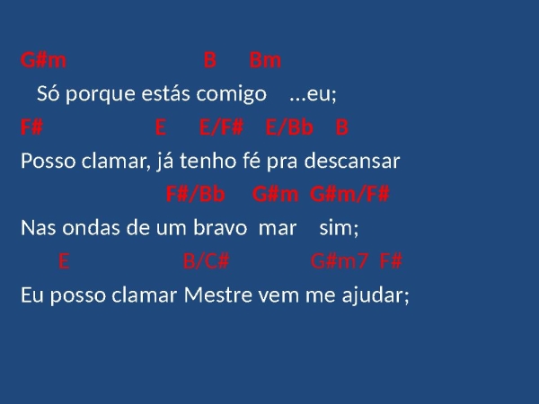 - G#m B Bm Só porque estás comigo ...eu;F# E E/F# E/Bb BPosso clamar, já tenho fé pra descansar F#/Bb G#m G#m/F#Nas ondas de um bravo mar sim; E B/C# G#m7 F#Eu posso clamar Mestre vem me ajudar;