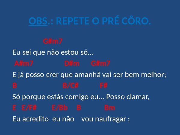 - OBS.: REPETE O PRÉ CÔRO. G#m7 Eu sei que não estou só... A#m7 D#m G#m7E já posso crer que amanhã vai ser bem melhor;B B/C# F# Só porque estás comigo eu... Posso clamar, E E/F# E/Bb B Bm Eu acredito eu não vou naufragar ;