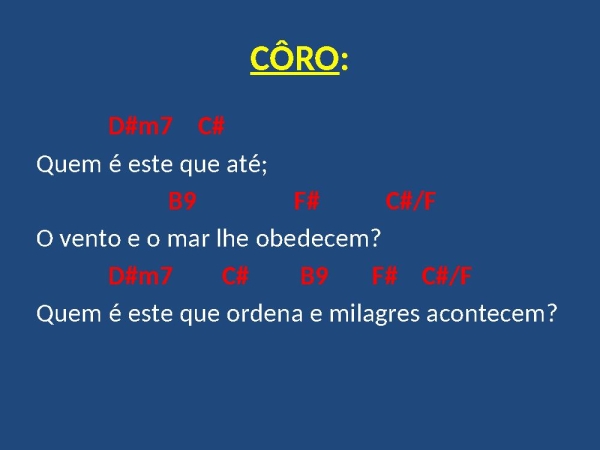 - CÔRO: D#m7 C# Quem é este que até; B9 F# C#/FO vento e o mar lhe obedecem? D#m7 C# B9 F# C#/FQuem é este que ordena e milagres acontecem?