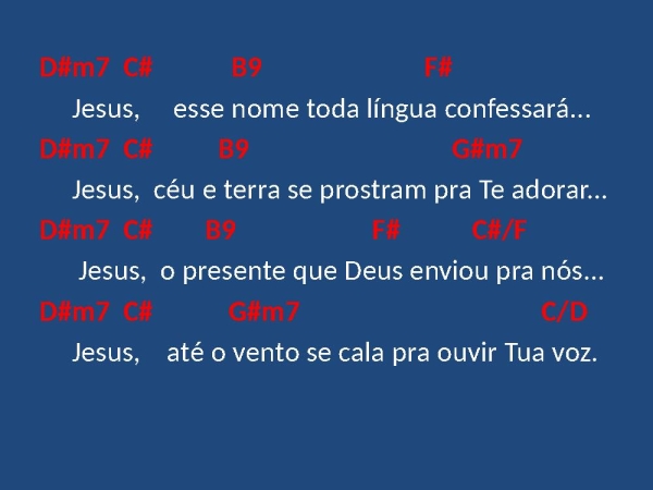 - D#m7 C# B9 F# Jesus, esse nome toda língua confessará...D#m7 C# B9 G#m7 Jesus, céu e terra se prostram pra Te adorar...D#m7 C# B9 F# C#/F Jesus, o presente que Deus enviou pra nós...D#m7 C# G#m7 C/D Jesus, até o vento se cala pra ouvir Tua voz.