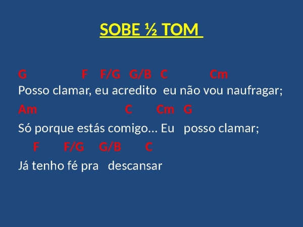 - SOBE ½ TOM G F F/G G/B C CmPosso clamar, eu acredito eu não vou naufragar;Am C Cm GSó porque estás comigo... Eu posso clamar; F F/G G/B CJá tenho fé pra descansar