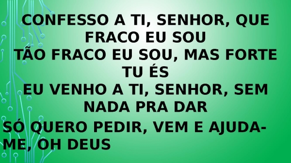 - Confesso a ti, Senhor, que fraco eu sou Tão fraco eu sou, mas forte tu és Eu venho a ti, Senhor, sem nada pra dar Só quero pedir, vem e ajuda-me, oh Deus