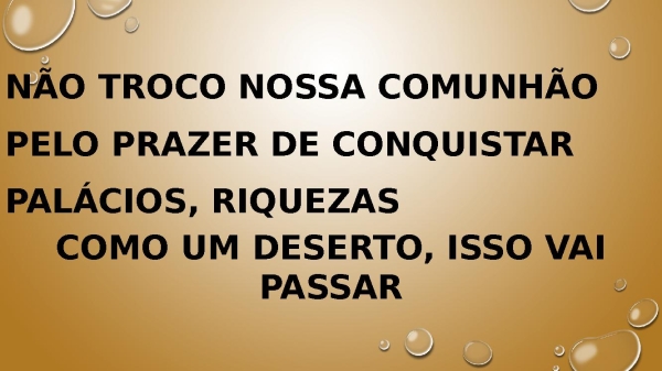 - Não troco nossa comunhão Pelo prazer de conquistar Palácios, riquezas Como um deserto, isso vai passar
