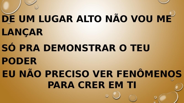 - De um lugar alto não vou me lançar Só pra demonstrar o Teu poder Eu não preciso ver fenômenos para crer em Ti