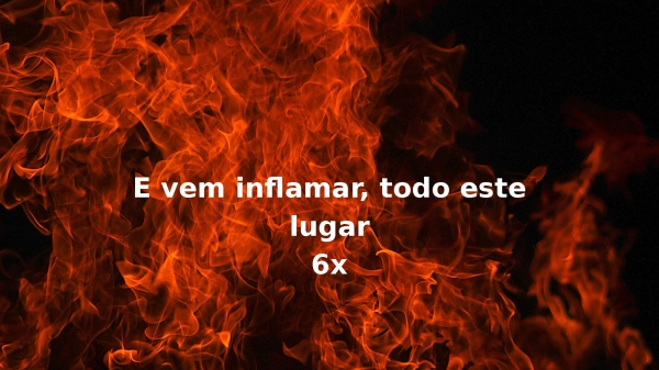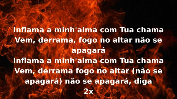 - Inflama a minh'alma com Tua chamaVem, derrama, fogo no altar não se apagaráInflama a minh'alma com Tua chamaVem, derrama fogo no altar (não se apagará) não se apagará, diga2x