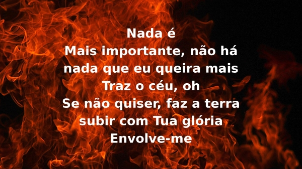 - Nada éMais importante, não há nada que eu queira maisTraz o céu, digaSe não quiser, faz a terra subir com Tua glóriaEnvolve-me, Envolve-me, envolve-me
