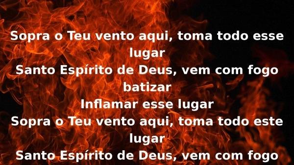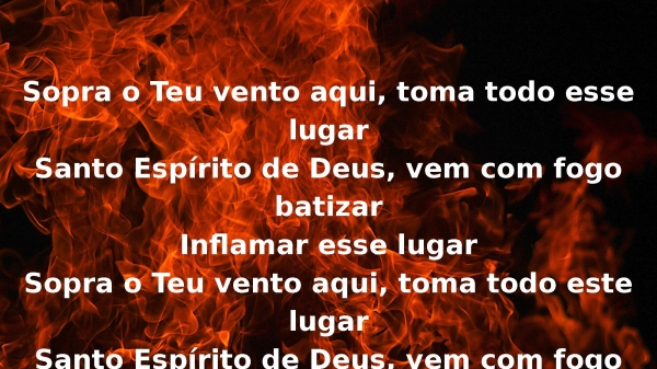 - Sopra o Teu vento aqui, toma todo esse lugarSanto Espírito de Deus, vem com fogo batizarInflamar esse lugarSopra o Teu vento aqui, toma todo este lugarSanto Espírito de Deus, vem com fogo batizar(Inflamar), peça com sua alma2x