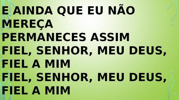 - E ainda que eu não mereça Permaneces assim Fiel, senhor, meu Deus, fiel a mim Fiel, senhor, meu Deus, fiel a mim