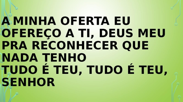 - a minha oferta euOfereço a ti, Deus meuPra reconhecer que nada tenhoTudo é teu, tudo é teu, senhor