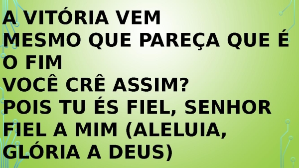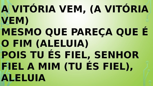 - A vitória vem, (a vitória vem) Mesmo que pareça que é o fim (aleluia) Pois tu és fiel, senhor Fiel a mim (tu és fiel), aleluia