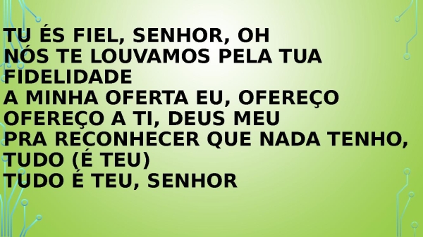 - Tu és fiel, senhor, ohNós te louvamos pela tua fidelidadeA minha oferta eu, ofereçoOfereço a ti, Deus meuPra reconhecer que nada tenho, tudo (é teu)Tudo é teu, senhor