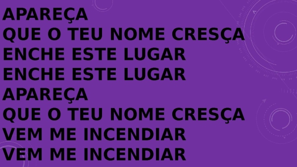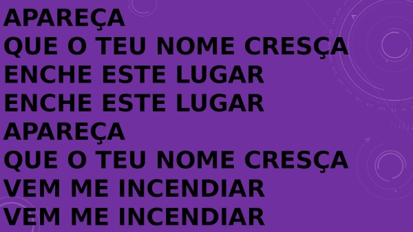 - Apareça Que o Teu nome cresça Enche este lugar Enche este lugar Apareça Que o Teu nome cresça Vem me incendiar Vem me incendiar